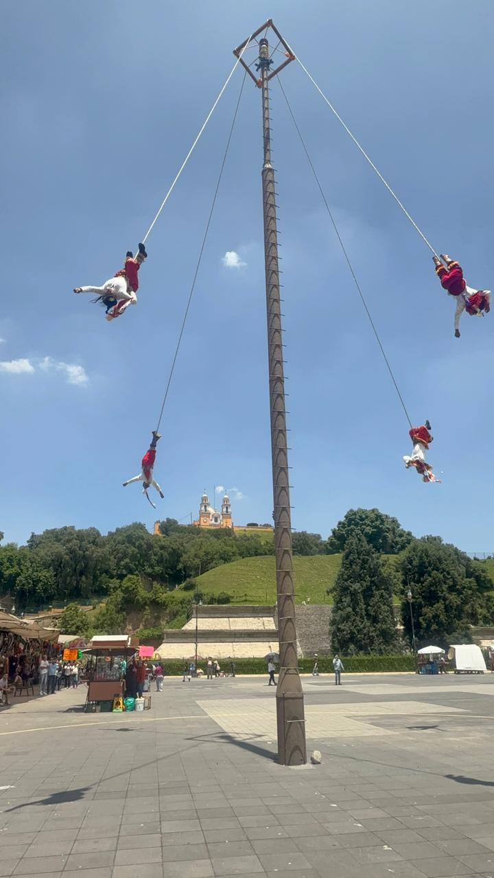 En el corazón de Cholula, todos los días puedes ser testigo de un espectáculo ancestral: los Voladores que, desde lo alto del poste en el Parque Soria, descienden lentamente al ritmo del tambor y la flauta, conectando el cielo y la tierra.